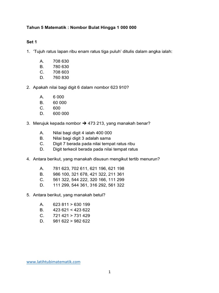 Tahun 5 Nombor Bulat Hingga 1000000 Set 1 Pdf Pdf